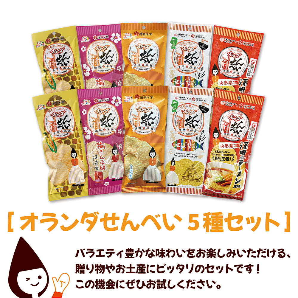オランダせんべい生地づくりにこだわった、酒田米菓を代表する元祖うす焼きせんべい。パリッと軽い歯ごたえと、お米本来の美味しさがやみつきに!